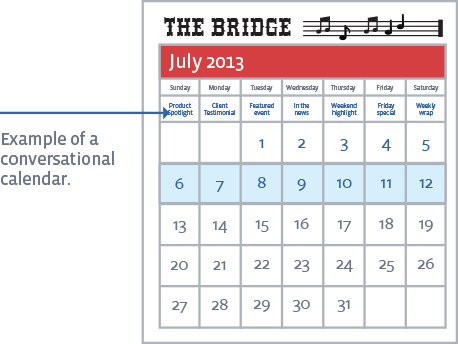 •    A maneira mais fácil para se manter em contato com os fãs é através da criação de um calendário com temas sobre o que falar a cada semana ou mês.