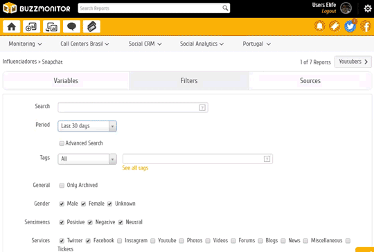 3. Em Filtros escolha o período de monitoramento e selecione apenas o Twitter como serviço, ele será o nosso índice para identificar influenciadores.
