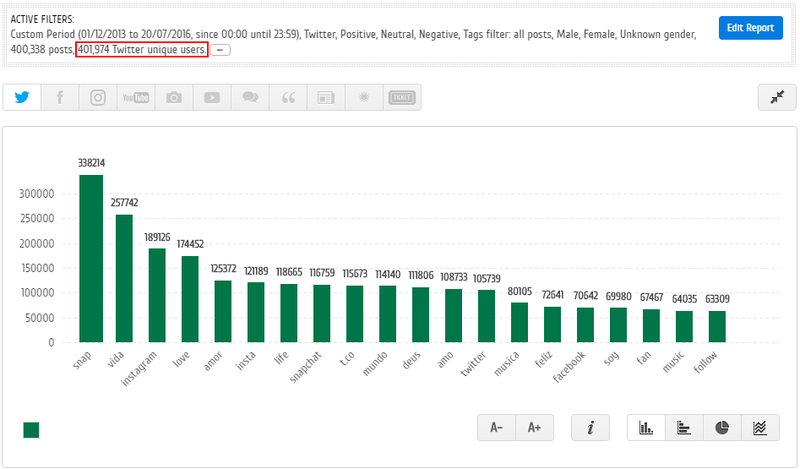 Ao procurarmos pelo termo booleano “snapchat OR snap” na conta Buzzmonitor Influencer, encontramos 401.974 usuários únicos no Twitter que citam “snap” nas suas biografias.