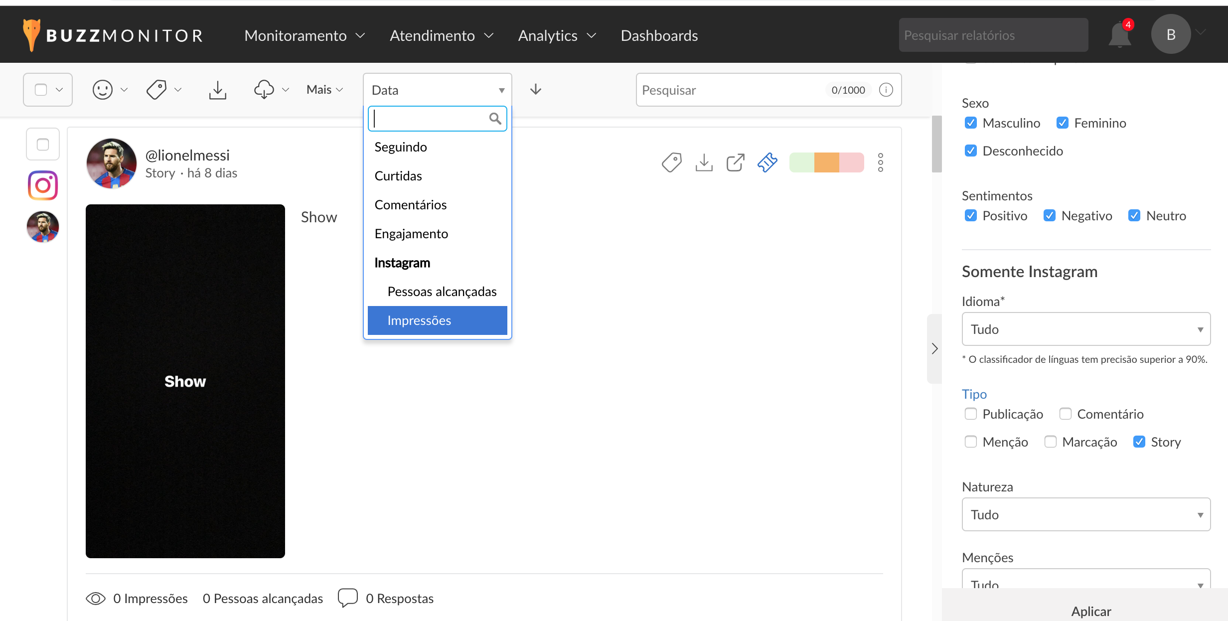 Foi adicionada a possibilidade de ordenar relatórios pelas métricas disponíveis para os Stories: Impressões e Pessoas Alcançadas.