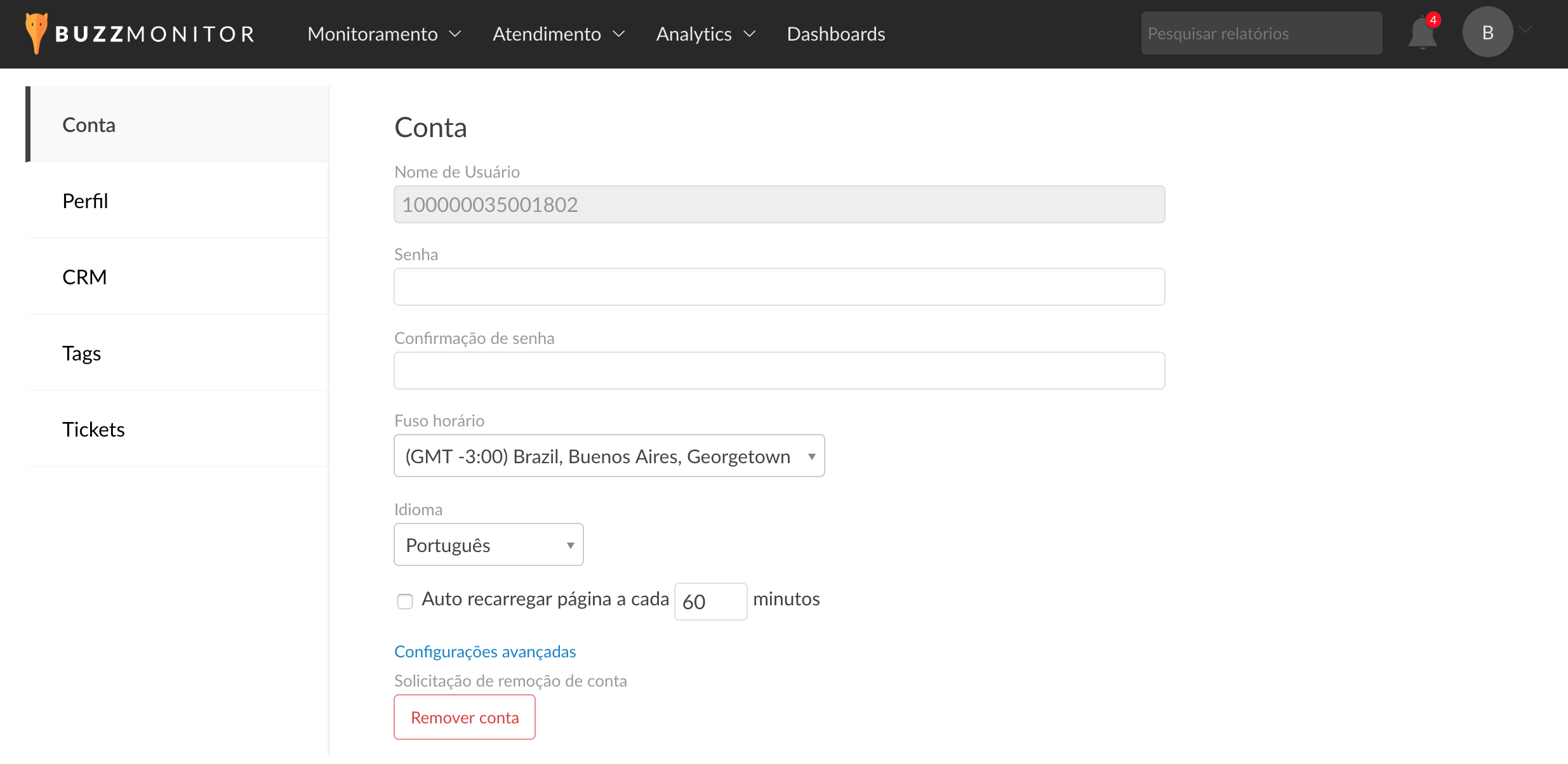 O usuário do Buzzmonitor agora poderá realizar a remoção de sua própria conta através da página de Configurações. Uma vez solicitada a remoção, o usuário terá o período de 7 dias para cancelar a solicitação e continuar com a conta. Para evitar uma remoção acidental, é preciso digitar o e-mail da conta para confirmar que realmente essa ação deve ser realizada.