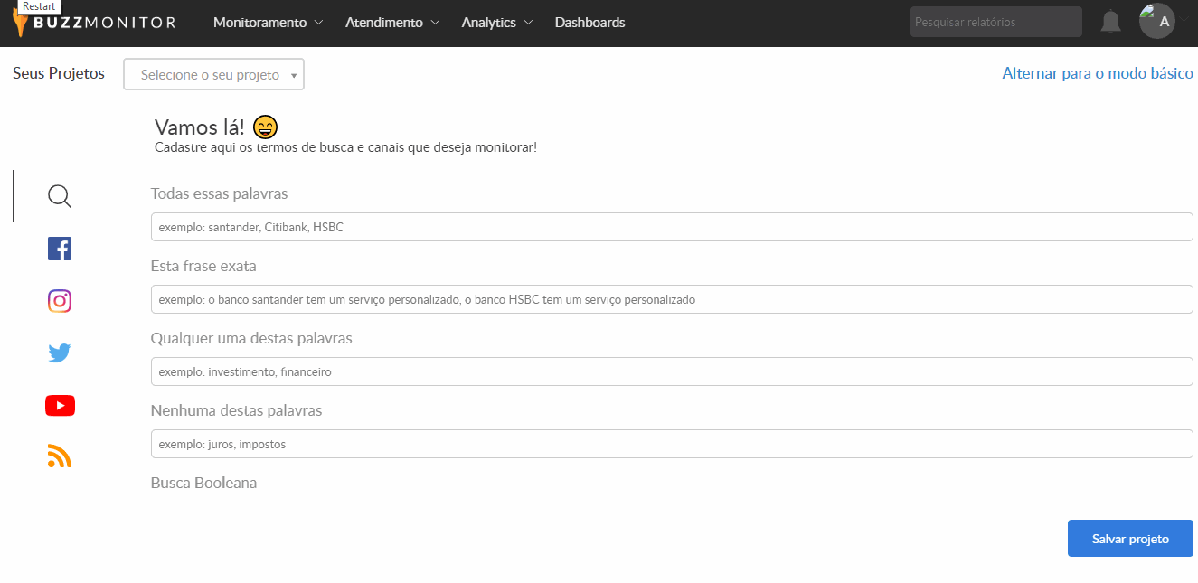 A página inicial do Buzzmonitor foi reformulada com o objetivo de facilitar o acesso aos projetos da conta e melhorar a visualização. A navegação na barra superior também teve modificações, com uma nova divisão por áreas de interesse: Monitoramento, Atendimento (CRM) e Analytics. Em cada uma dessas há um submenu de navegação com os módulos relacionados.