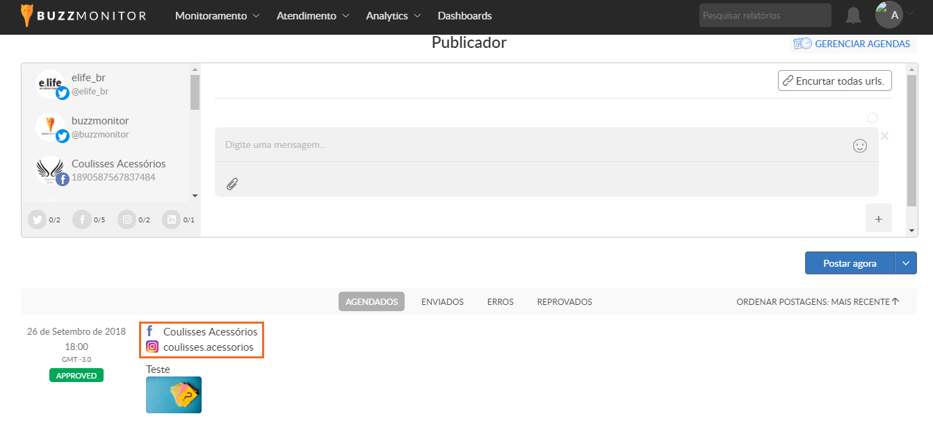 Ao realizar uma mesma postagem para diferentes perfis, o histórico de agendamentos irá exibir apenas um item na lista com todos os perfis que foram selecionados para o agendamento. Além de facilitar a visualização das postagens programadas, isso também permite que seja feita uma única edição em todas as publicações.