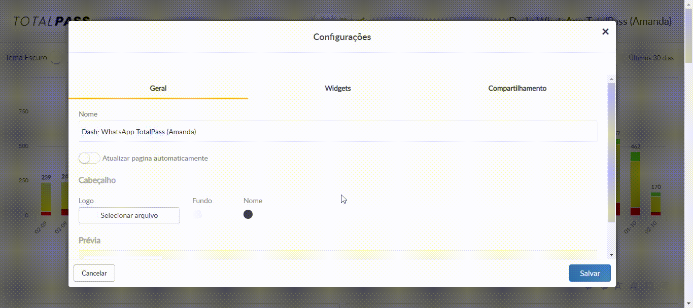 No canto superior da tela de relatórios, clique na opção “Ver dashboard” e você será encaminhado para uma tela com todos os relatórios. Após isso, clique em “Editar” selecione a opção “Widgets” e selecione quais relatórios você quer que apareça no seu Dashboard.