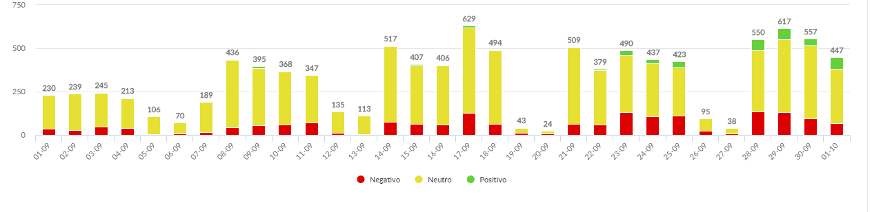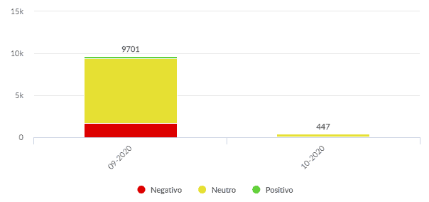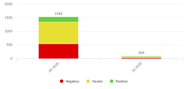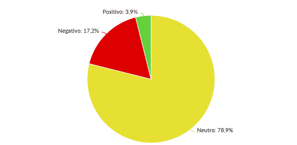 Divisão percentual por sentimento (positivo, negativo ou neutro) das mensagens recebidas no WhatsApp da marca durante o período analisado. O Buzzmonitor utiliza inteligência artificial para análise do sentimento das mensagens.