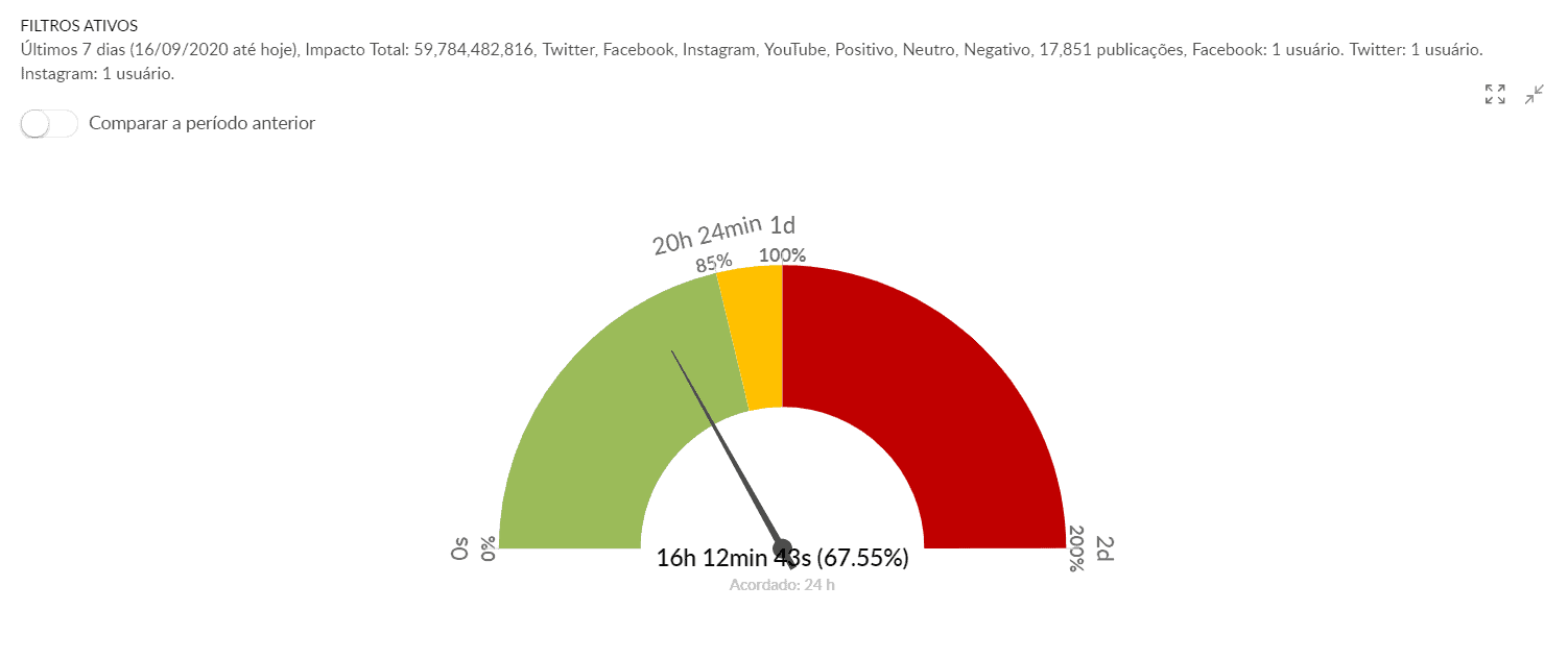 Mostra a média do tempo que levou para as interações serem respondidas. Na parte inferior do gráfico, consta o SLA acordado – a meta de tempo máximo de resposta estabelecido pela empresa. E o gráfico é dividido em três cores: verde para bom (SLA médio de até 85% do estabelecido); amarelo para atenção (SLA médio de 85% a 100% do estabelecido); e vermelho para ruim (SLA acima do estabelecido).