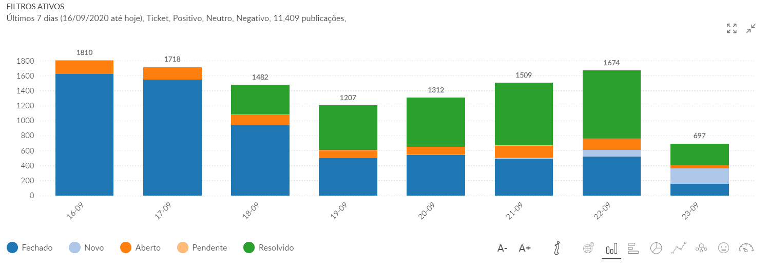 É o total de respostas enviadas por dia pela sua marca. Ajuda a entender a produtividade de dias específicos e a constância dos atendimentos, além de analisar a variação de atendimentos em eventos isolados, como feriados, datas comemorativas, etc.