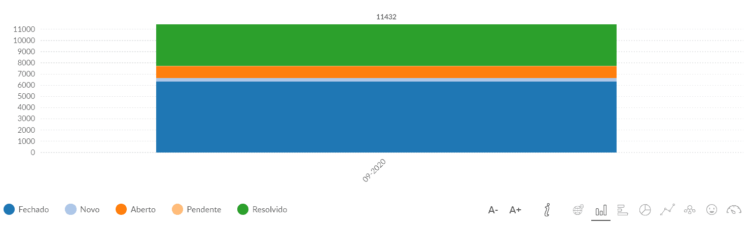 Mostra o total de tickets do mês e seus status. Traz uma visão macro da resolução de problemas dos clientes ao longo do mês e indica se a meta de solução da empresa foi alcançada.