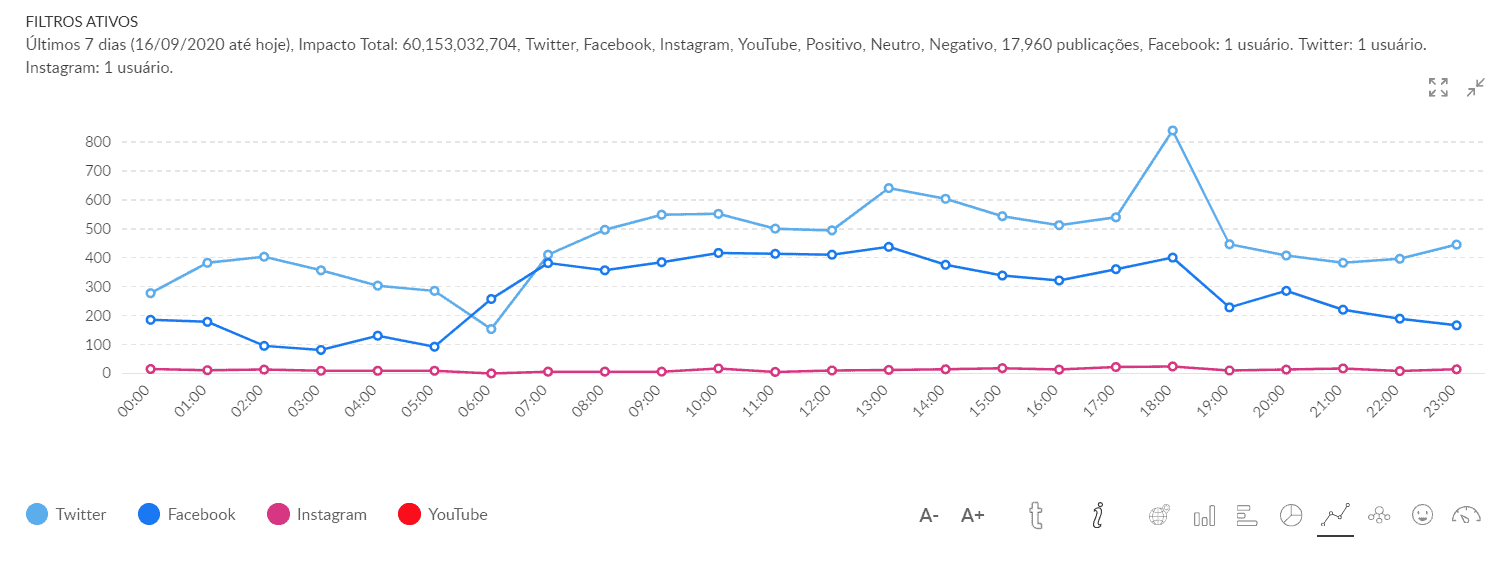 Identifica os horários de respostas da marca e pode apontar picos ou baixas na produtividade do time durante o dia. Também é dividido por rede social.