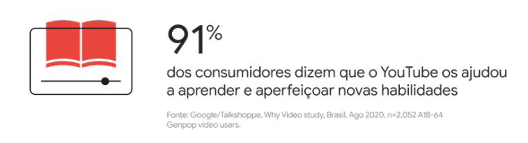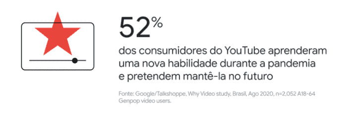 Segundo estudo do Google, durante esse ano atípico de pandemia, o YouTube se transformou num importante aliado do dia a dia dos brasileiros entre 18 a 64 anos. Segundo o estudo, 91% dos consumidores disseram que o YouTube os ajudou a aprender novas habilidades.