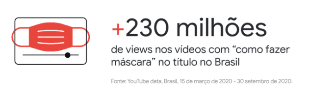Outro dado interessante é a quantidade de procura de como fazer máscaras devido ao uso obrigatório de máscaras neste período de pandemia. Foram mais de 230 milhões de visualizações em vídeos de tutoriais.
