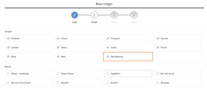Os triggers agora permitem a seleção de fontes de miscellaneous, como blogs, por exemplo, para monitoramento. Isso significa que sua marca poderá criar alertas usando inúmeras fontes para acompanhar. Por exemplo: se um blog cita sua marca, você poderá receber um alerta e verificar o que foi falado naquela publicação.