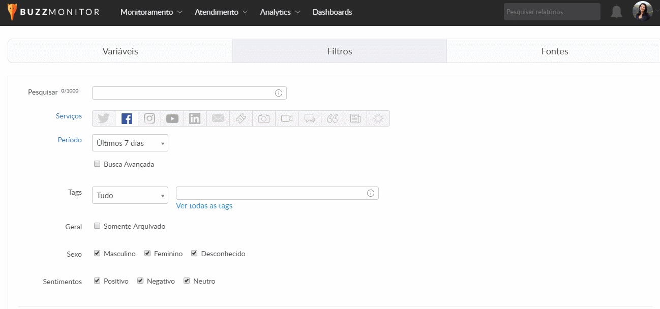 Para criar esses reports, clique em Ver todos os filtros, vá até a aba Fontes e em Páginas do Facebook selecione o campo Private Messages da sua conta que possui um bot.