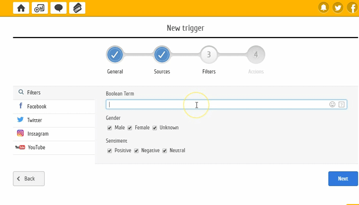 Foi adicionada uma validação para o termo booleano do Trigger. Agora passa a ser exibido um alerta caso o termo seja inválido, o que reduz a zero a possibilidade de cadastro de termos incorretos durante a criação de um novo Trigger. O seu monitoramento não será mais prejudicado por termos booleanos incorretos. Sabemos que criar termos não é uma tarefa fácil e por isso lançamos essa melhoria. O analista terá mais facilidade e segurança durante a criação de termos e terá Triggers corretos para atender sua demanda.