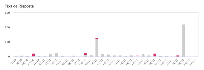 Este gráfico mostra quantas interações foram respondidas (em rosa) e quantas não foram (em cinza) em cada dia.