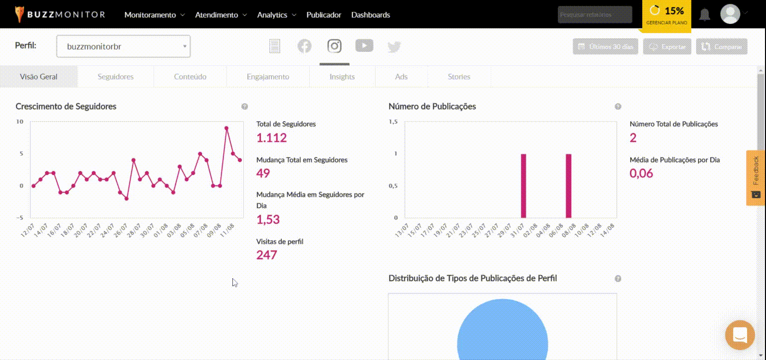 Usando o Buzzmonitor você consegue ter essas métricas em tempo real através do Buzzmonitor Analytics e também comparar sua performance com os concorrentes, além de entender qual de suas publicações teve mais engajamento em diferentes períodos.
