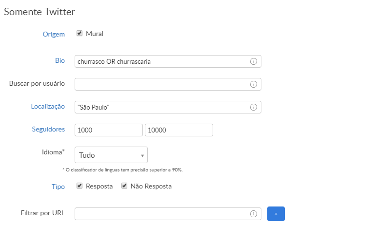 No exemplo, selecionamos a rede social Twitter, escrevemos “Churrasco” e “Churrascaria” em bio para localizar bios com esse termo, escrevemos “São Paulo” na localização para encontrar influenciadores de São Paulo e determinamos a quantidade de seguidores.