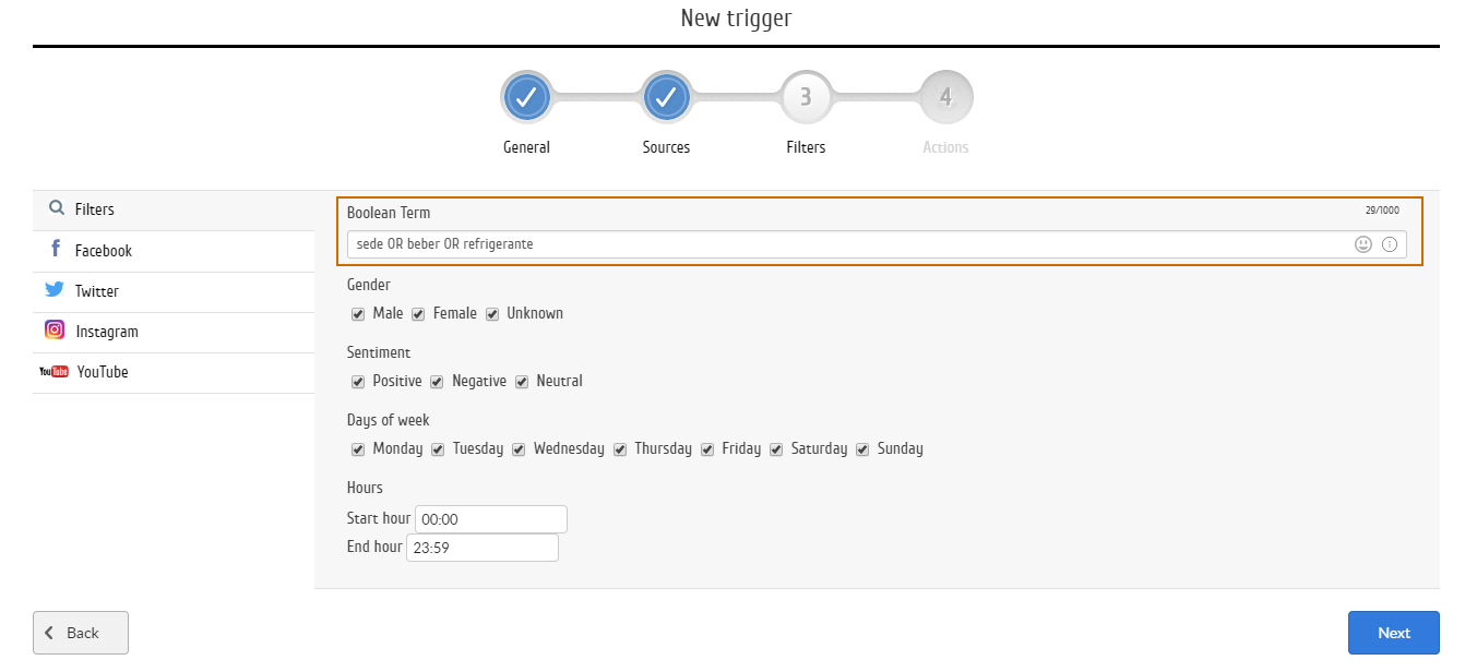 Com os triggers é possível personalizar um alerta exatamente de acordo com sua demanda. No caso, selecionamos as palavras “sede”, “beber” e “refrigerante” para que o analista sempre esteja a par das publicações que possam gerar uma oportunidade de ação com o influenciador.