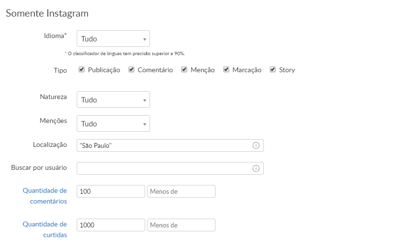 No exemplo, selecionamos a localização “São Paulo” no Instagram e definimos que os posts devem ter pelo menos 100 comentários e no mínimo 1.000 curtidas.