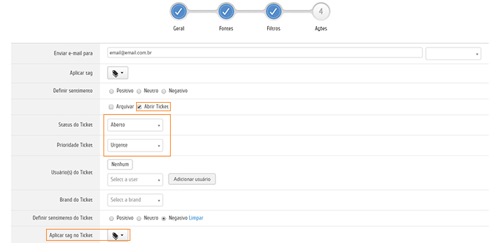 - Em Ações você definirá as configurações desse ticket. Por exemplo: comentários de usuários insatisfeitos com o seu produto receberão um ticket automático com status Aberto e prioridade Urgente.