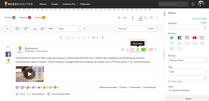 - Dentro do seu report, clique na publicação feita pelo usuário em que você deseja adicionar um ticket. Depois clique no ícone de ticket na barra de sentimentos para criar um novo ticket.