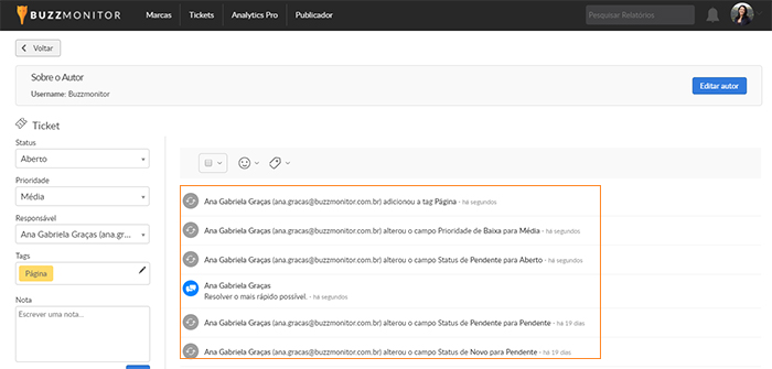 - Todas as edições feitas naquele ticket, como tags e sentimentos, além das mensagens trocadas entre o usuário e a marca, aparecerão listadas.