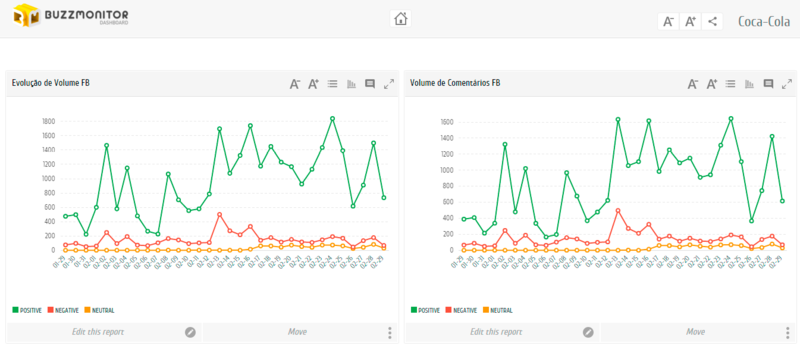 Um dos resultados dessas configurações é o relatório Volume de Comentários no Facebook, que pode ser visto neste dashboard. Nele vemos o buzz de comentários feitos por usuários na página da marca, enquanto que no Evolução de Volume no Facebook vemos comentários, posts e replies.