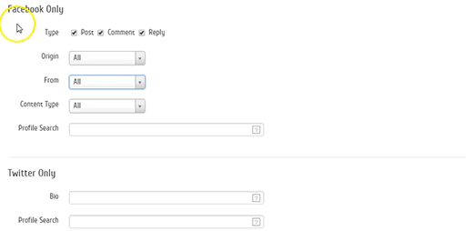 O menu Facebook Only, em Edit Report, permite que você isole a busca por posts, comentários ou replies e concentre-se no monitoramento das interações feitas somente por usuários. Para isto, em todos os relatórios altere o From para User e selecione as opções de Type de acordo com o que você procura.