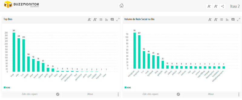 A Bio permite que você monitore os termos mais utilizados pelos usuários na mini biografia do Twitter. Além de ser útil no perfilamento da audiência, também pode ser usado para descobrir em quais outras redes sociais o seu público está. No dashboard abaixo vemos estas duas possibilidades nos relatórios Top Bios e Volume de Rede Social na Bio.