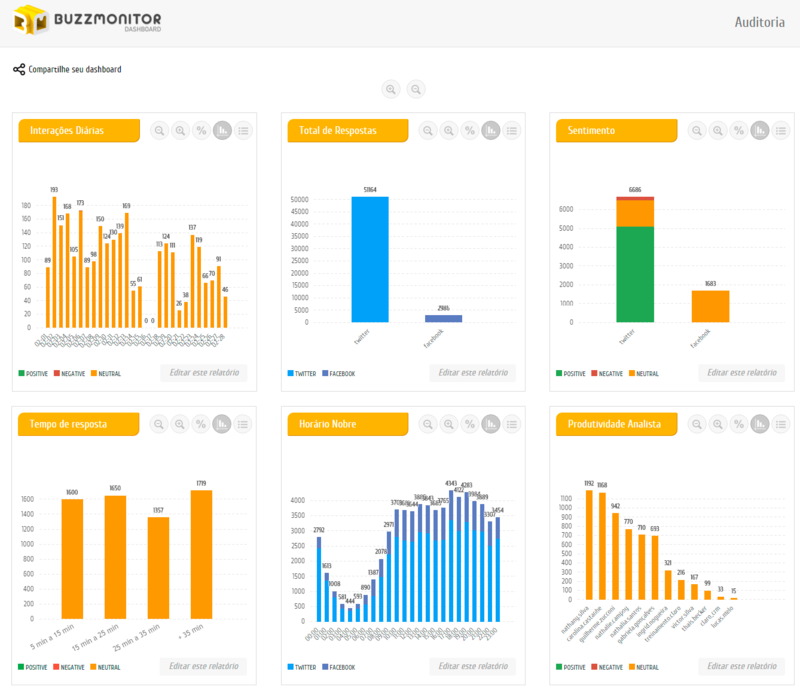 Com um dashboard focado em Social CRM você poderá verificar o desempenho dos seus analistas e se a demanda está sendo atendida apropriadamente. O Buzzmonitor permite também que seja definido o tempo de atualização dos gráficos, assim você não perderá nenhum minuto do que está acontecendo na sua página!