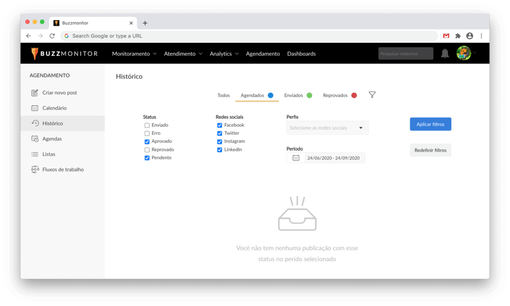 Agora na seção de histórico do Agendamento é possível filtrar as publicações agendadas por projeto e status, facilitando a busca e a organização das postagens que já foram publicadas ou que ainda serão.