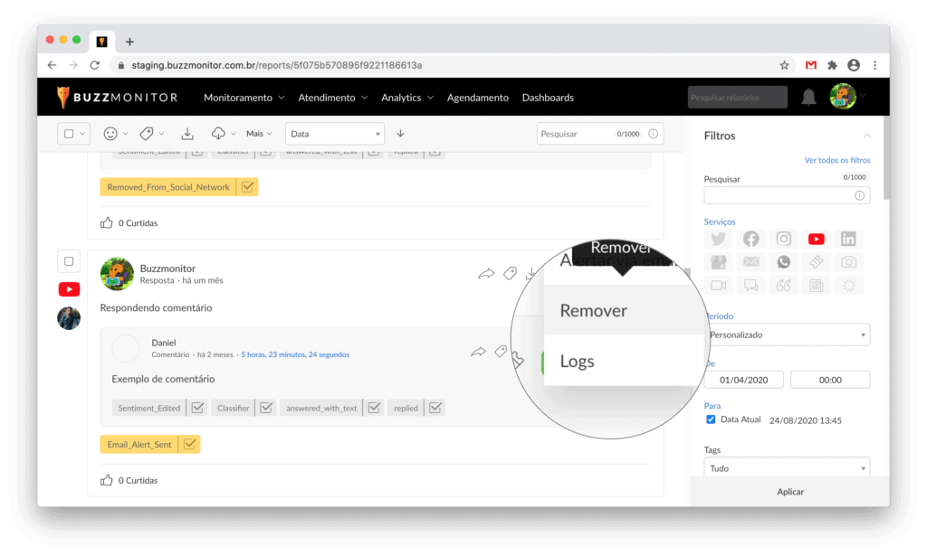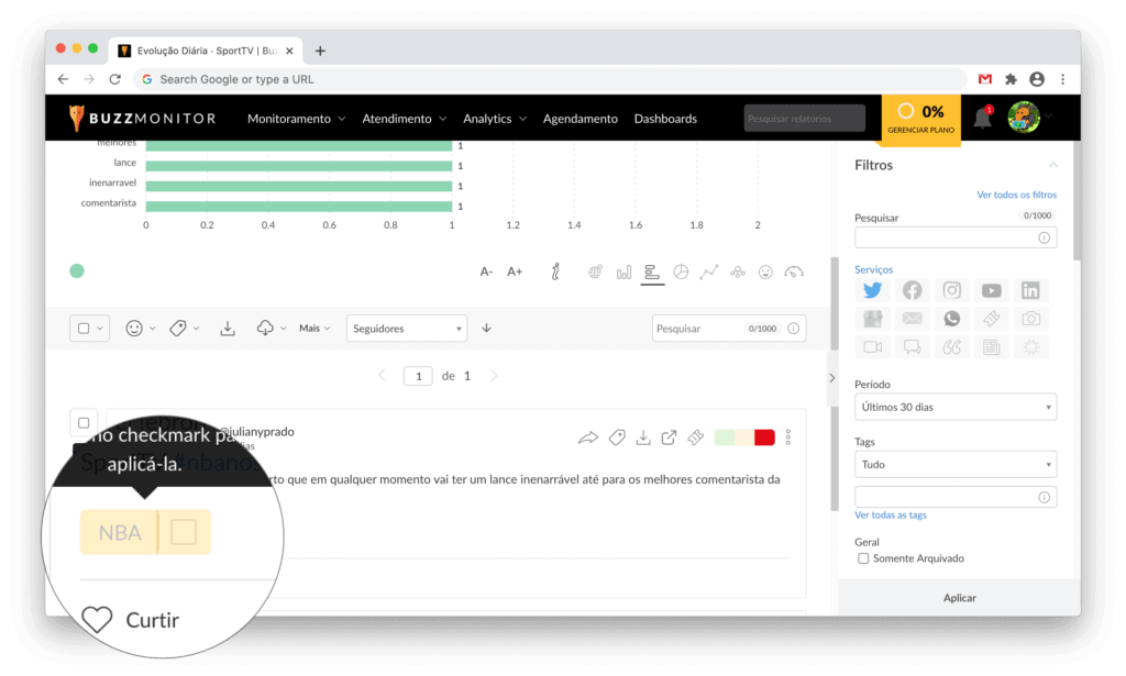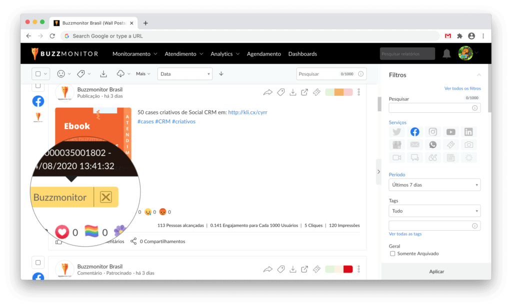Após a classificação de pelo menos 100 interações de um projeto, o Buzzmonitor passa a sugerir até 3 tags de acordo com o conteúdo da interação, agilizando o trabalho do time de tagueamento de conteúdo.