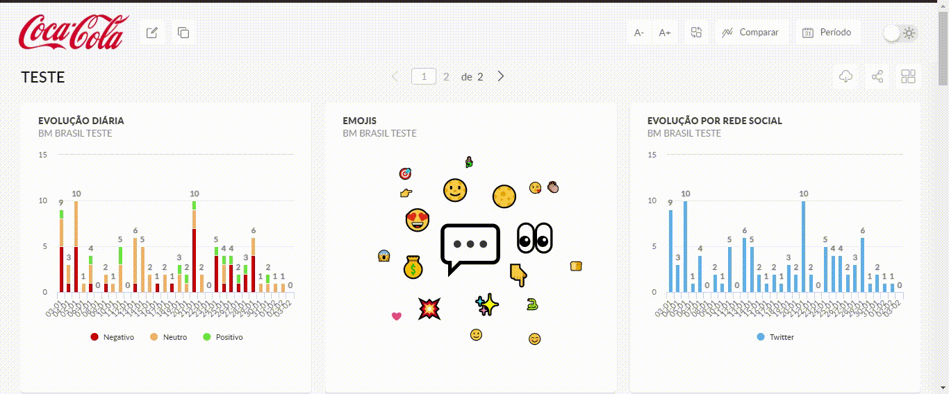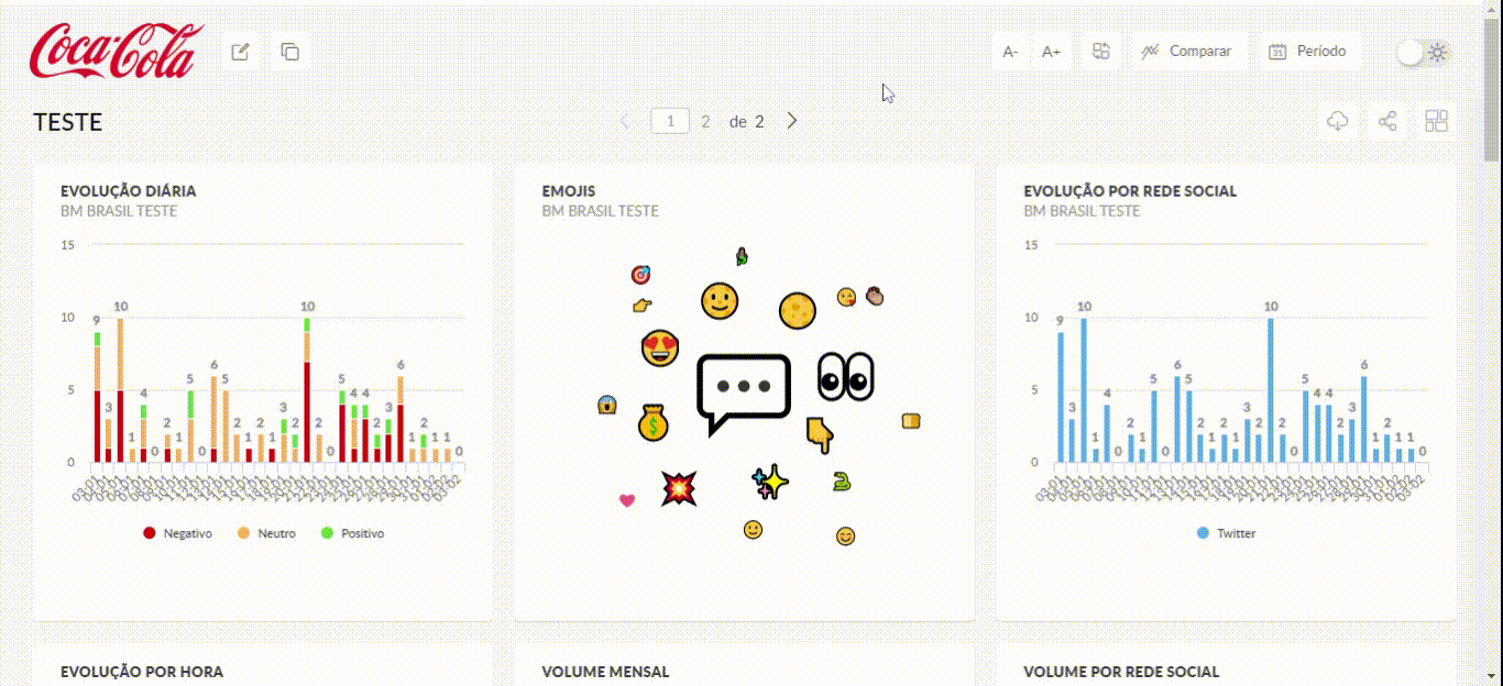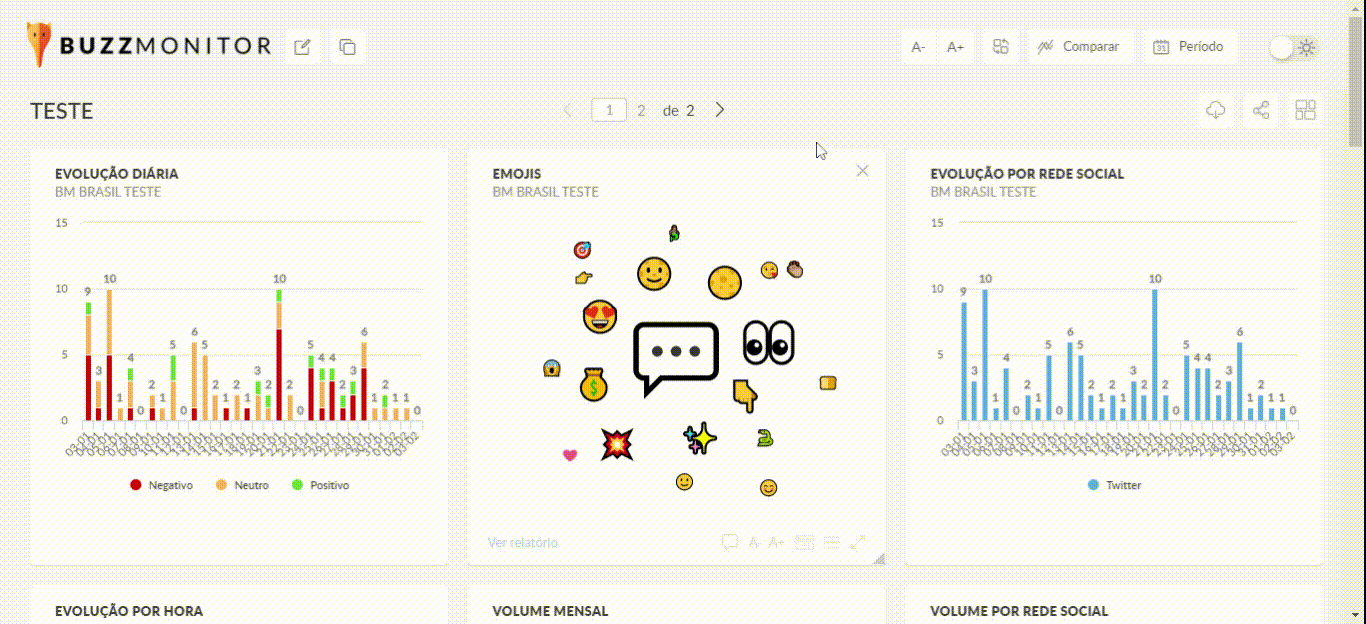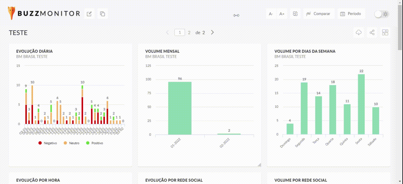 Cada página do dashboards pode ser preenchida com até 15 widgets (relatório, imagem e texto).