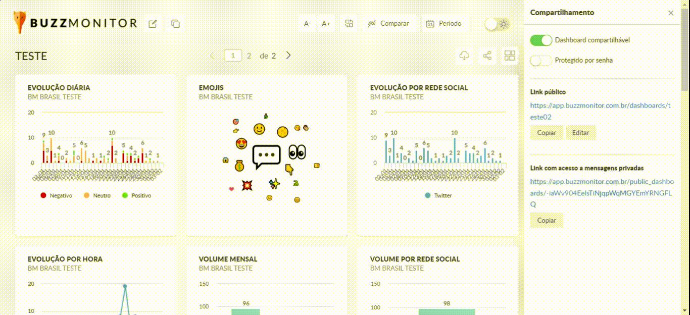 *Importante! Quando você compartilhar seu dashboard, todas as alterações permanecerão da forma como você configurou. Além disso, quem receber o link do dashboard não poderá alterá-lo.