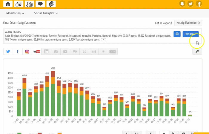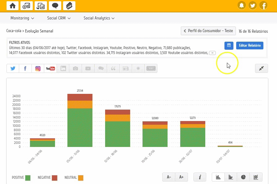 Na versão anterior do Buzzmonitor, as labels do gráfico eram exibidas como Week1, Week2, Week3. Agora as semanas serão exibidas a partir do intervalo das datas de cada uma destas semanas. Ou seja, Week1 passará a ser mostrada como 26/06 a 02/07, por exemplo. Isto torna a visualização mais rápida, sem ser necessário que o analista verifique quais são as datas da semana monitorada.
