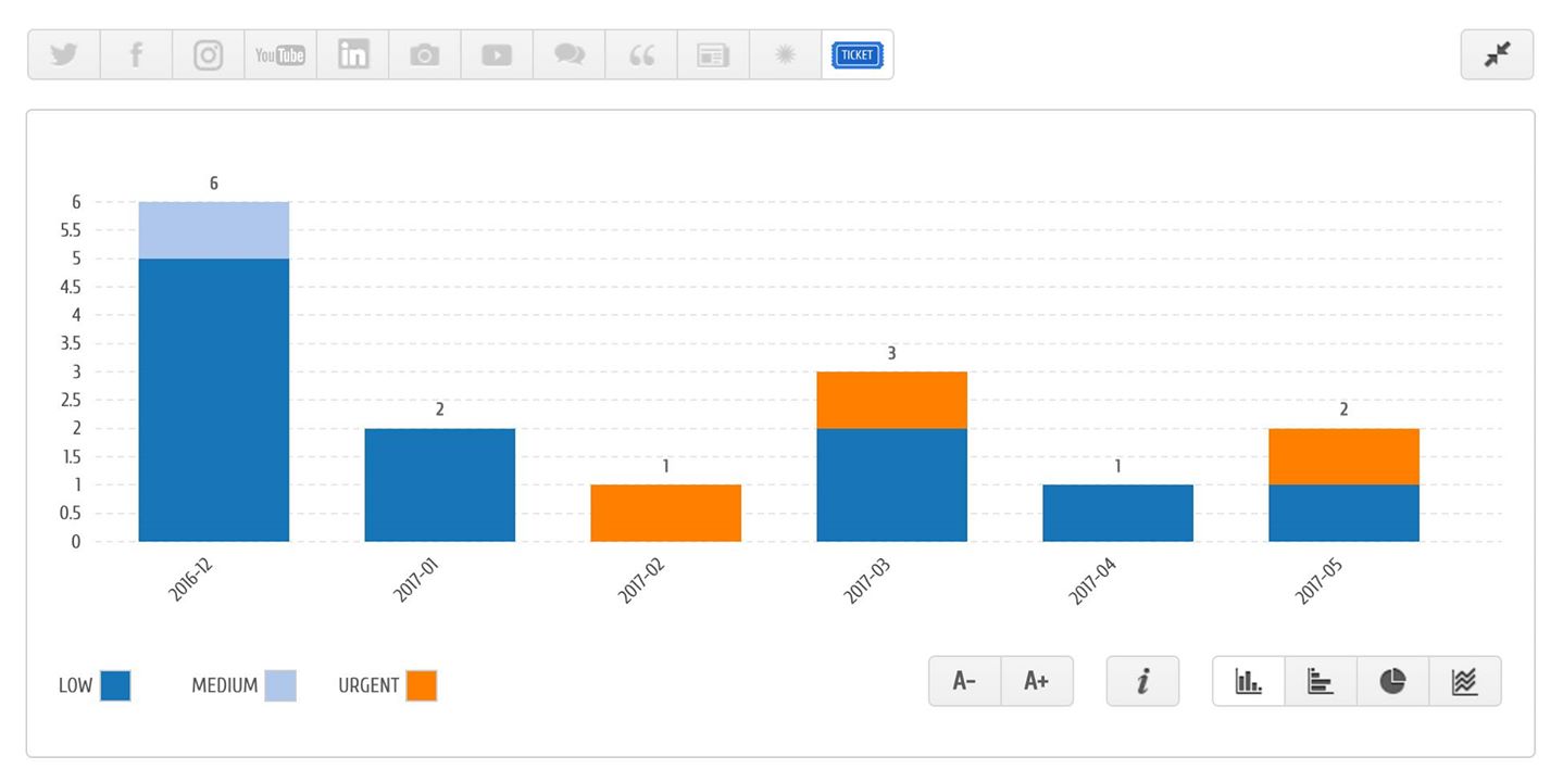 Os gráficos no Buzzmonitor agora têm um novo agrupamento e uma nova divisão de acordo com a prioridade dos Tickets criados. Dessa maneira é possível monitorar e gerir uma crise, por exemplo, já que Tickets urgentes (no caso) poderão ser visualizados separadamente nos relatórios, auxiliando a gestão de crises feita pelo analista de Social Media. Aqui explicamos passo a passo como criar um Ticket.