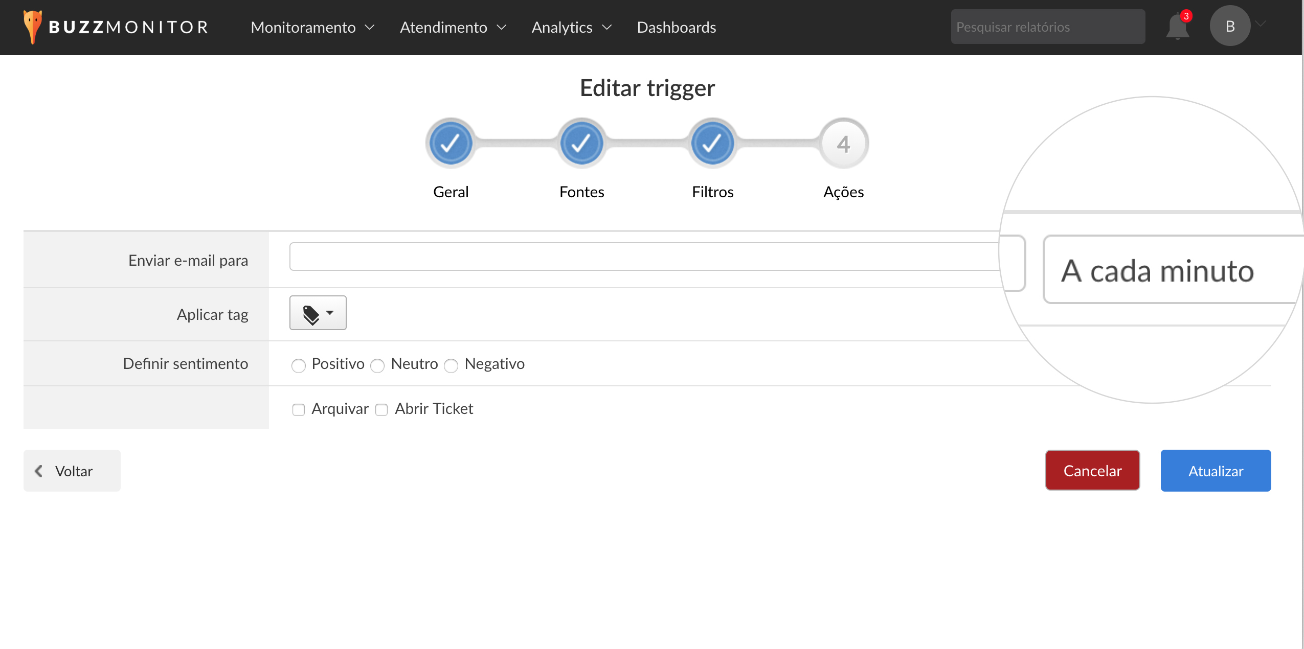Foi adicionado um intervalo de apenas 1 minuto para envio de alertas através dos triggers. Essa novidade é importante principalmente durante uma crise. Ao configurar o envio de alertas a cada um minuto, você ficará sabendo em tempo real tudo o que está acontecendo em relação à sua marca.