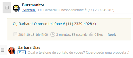 Ao expandir a visualização de um post no módulo de Social CRM, se o mesmo foi respondido através do Buzzmonitor, é exibido o ícone de um relógio com o tempo que passou desde a data da publicação até a resposta do social media.