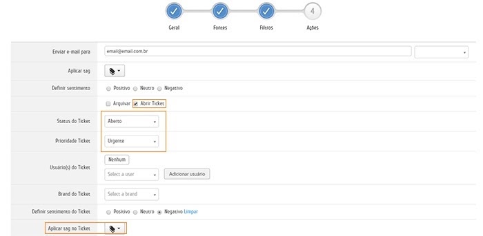 5. Na última etapa, Ações, defina o e-mail para o qual serão enviados os alertas e escolha as tags que serão aplicadas automaticamente e o sentimento atribuído às interações coletadas. Você pode até mesmo criar um ticket para o caso.