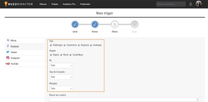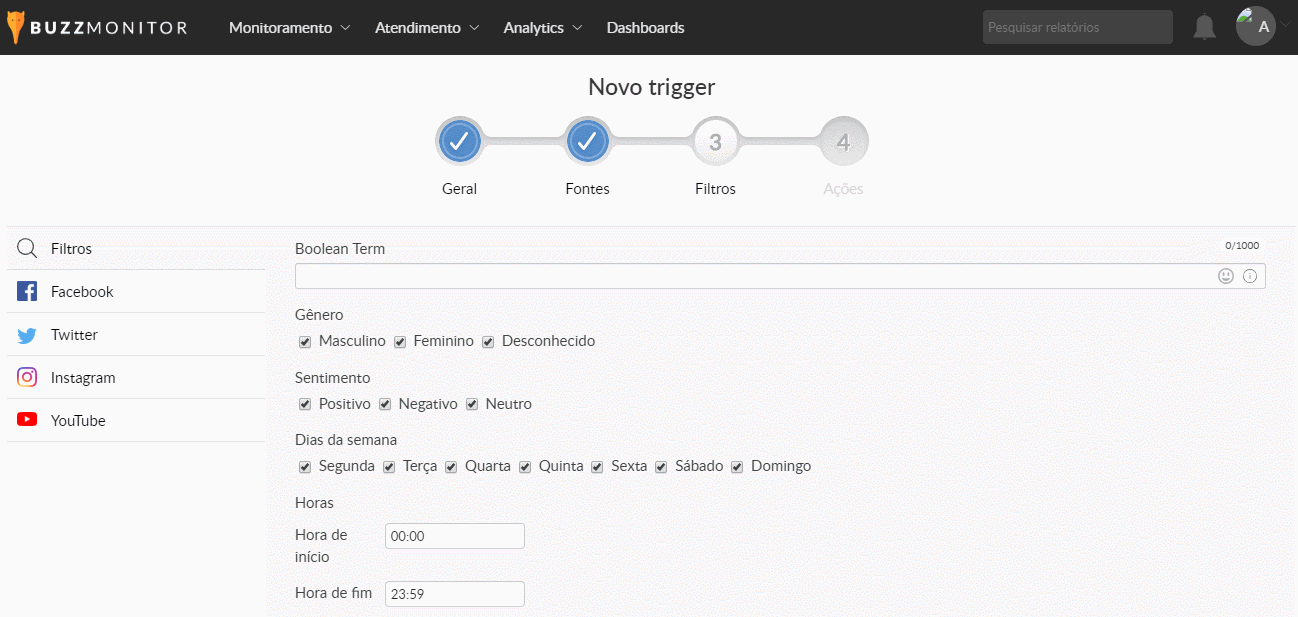 4. Em Filtros, defina os termos booleanos com as palavras que ativarão o Trigger e configure o gênero, sentimento, dias da semana e horários. Você também pode clicar nas abas Facebook, Twitter, Instagram e YouTube para obter filtros específicos para cada rede.