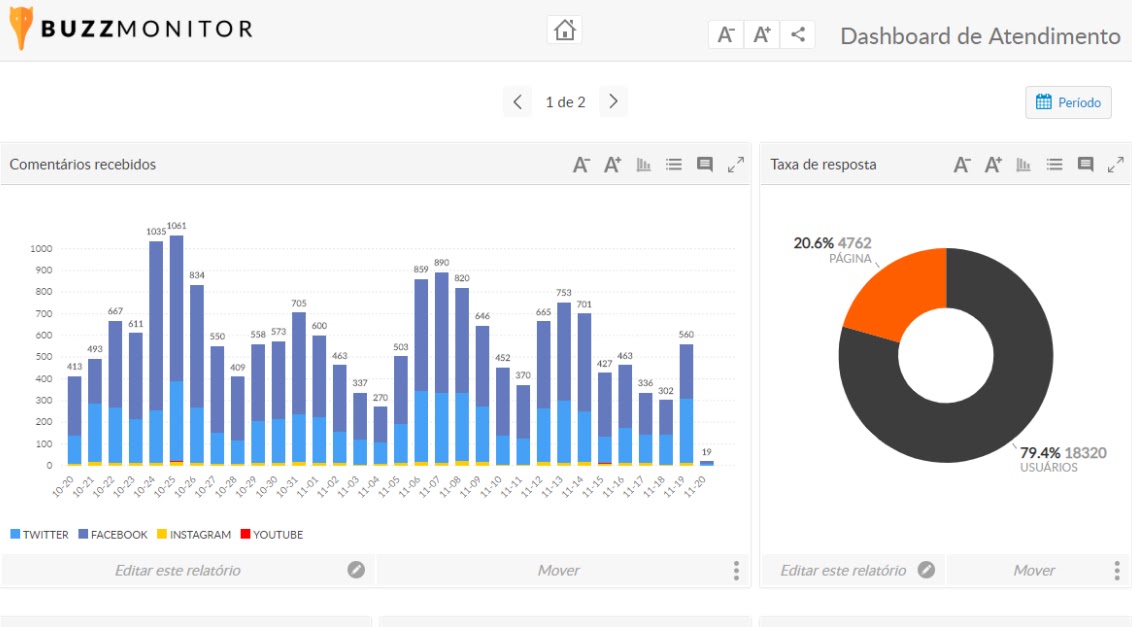 Os dashboards, que explicamos na parte de Atendimento, são também uma solução de monitoramento para obter insights rapidamente, com personalização e compartilhamento facilitados, pois reúnem simultaneamente diversos relatórios e gráficos de monitoramento e analytics.