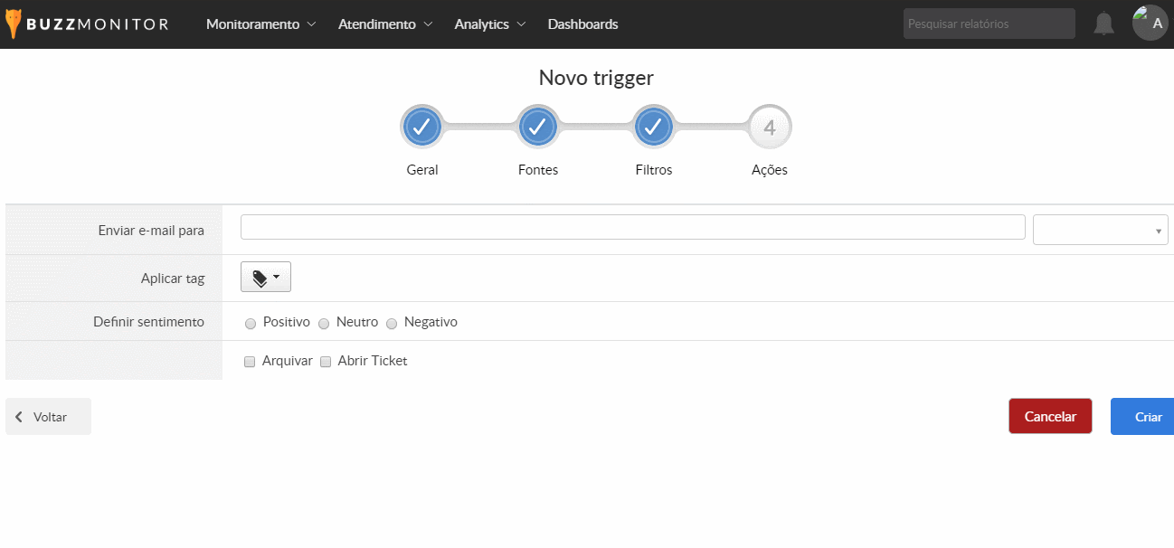Para criar tickets automáticos, você utilizará o módulo Triggers, do Buzzmonitor (veja aqui como criar um trigger para sua conta).