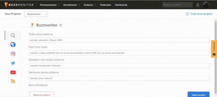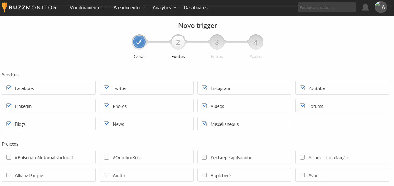 3. Em Fontes, selecione em quais Serviços, Projetos e Perfis (Twitter, Instagram, Facebook e LinkedIn) o alerta será aplicado.