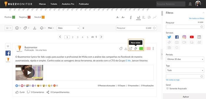Dentro do seu relatório, clique na publicação feita pelo usuário em que você deseja adicionar um ticket. Depois clique no ícone de ticket na barra de sentimentos para criar um novo ticket.