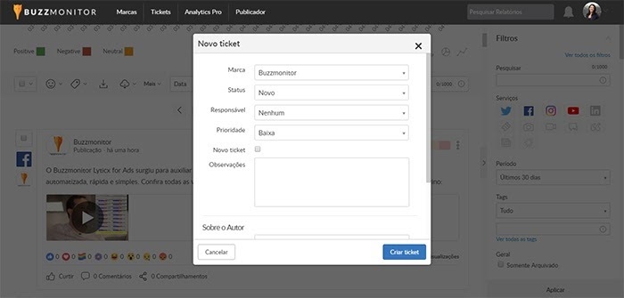 Ao receber as postagens nas redes sociais, além de armazenar a publicação e suas informações, o Buzzmonitor permite que seja configurada a abertura automática ou manual de um ticket.