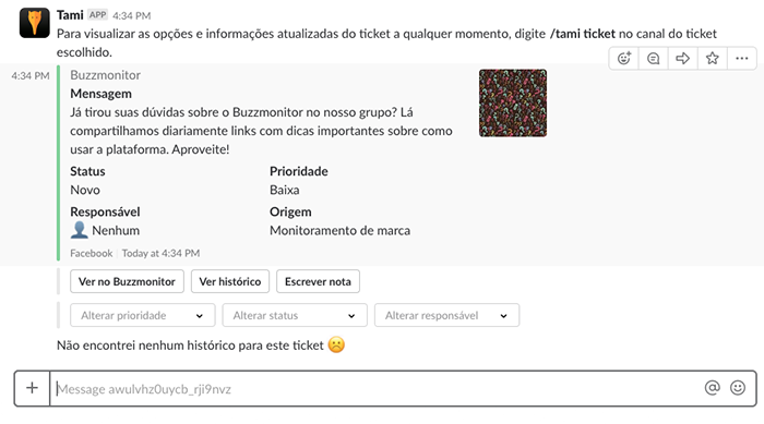 A integração é oferece diversas ações de tickets do Buzzmonitor diretamente no próprio Slack, como alteração de status e prioridade e visualização de histórico, além de escrever notas e conseguir visualizar todas as informações necessárias para interagir com o usuário.