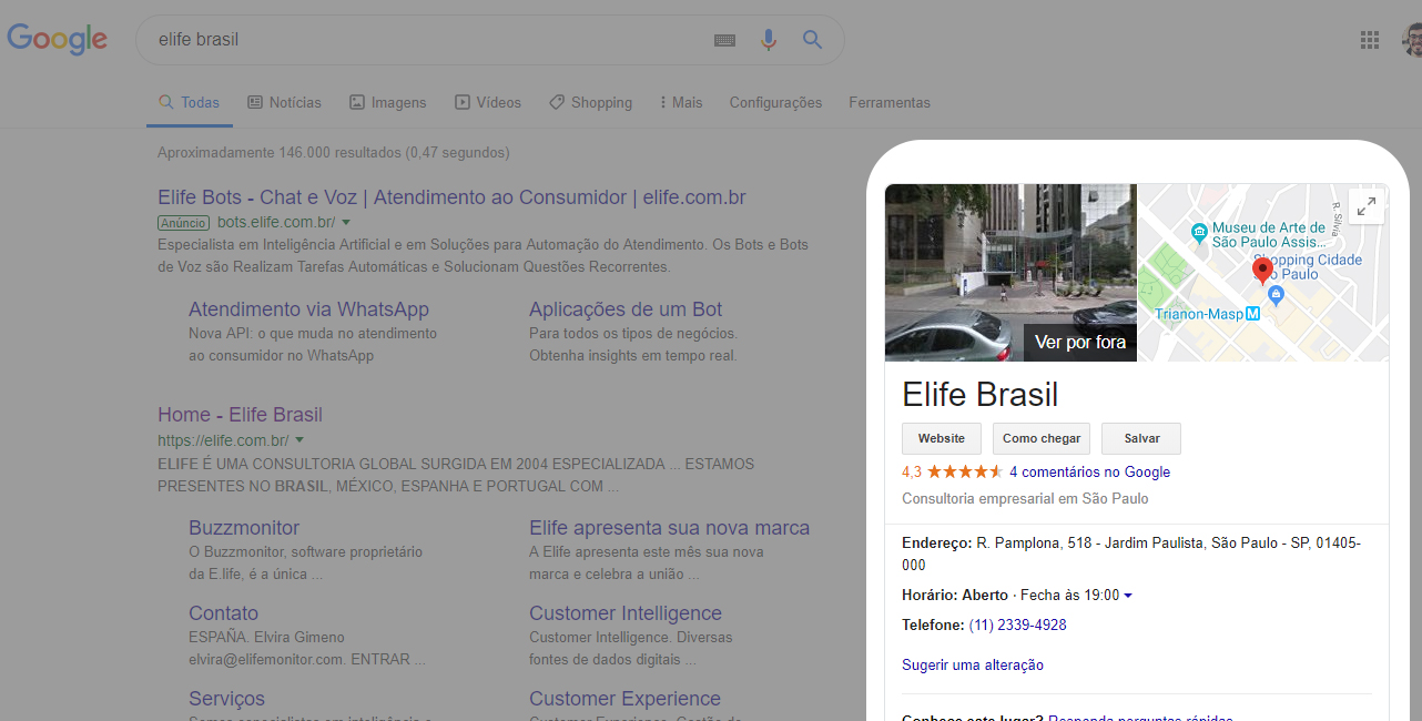 Após uma empresa criar seu perfil no Google My Business, sempre que um usuário buscar por ela no Google Search será exibido à direita, ao lado dos resultados de busca, um resumo da empresa e de sua localização no mapa, seguido da pontuação média deixada pelos clientes (de 1 a 5 estrelas) e dos principais reviews, como são chamadas as avaliações dos consumidores.