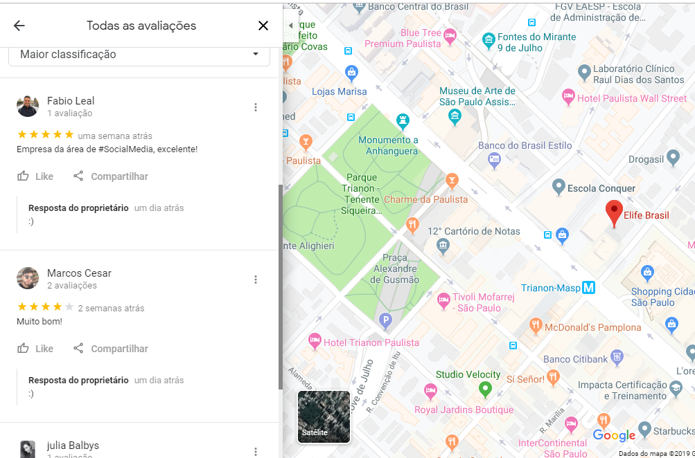 Da mesma forma, quando um consumidor busca pela localização da empresa no Google Maps, ele pode ver à esquerda do mapa as principais avaliações.
