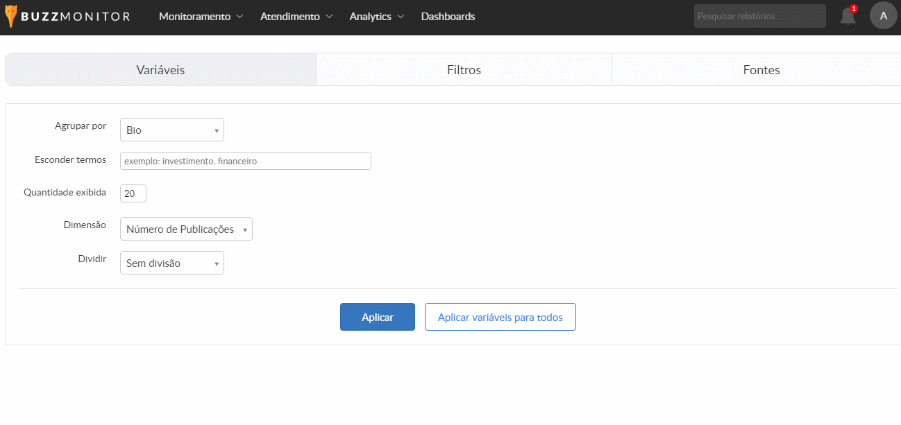 2. Depois crie mais dois relatórios, agora para as top bios. Em Variáveis, configure para agrupar por Bio e em Filtros selecione o período de setembro/18 em um relatório e outubro/18 em outro.
