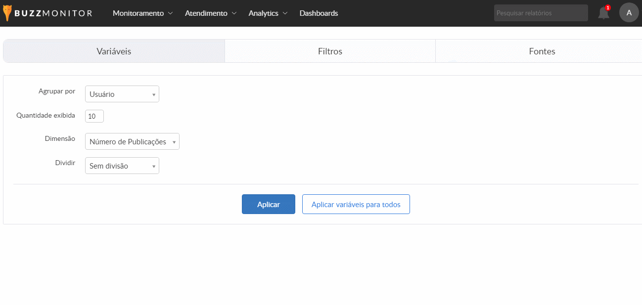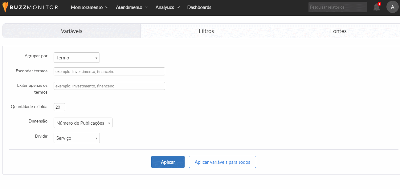OBS: neste módulo não é possível personalizar o período com datas quebradas, sendo necessário usar as opções pré-configuradas pelo Buzzmonitor (hoje, última hora, últimas 24 horas, últimos 7 dias e últimos 30 dias).